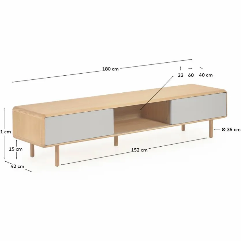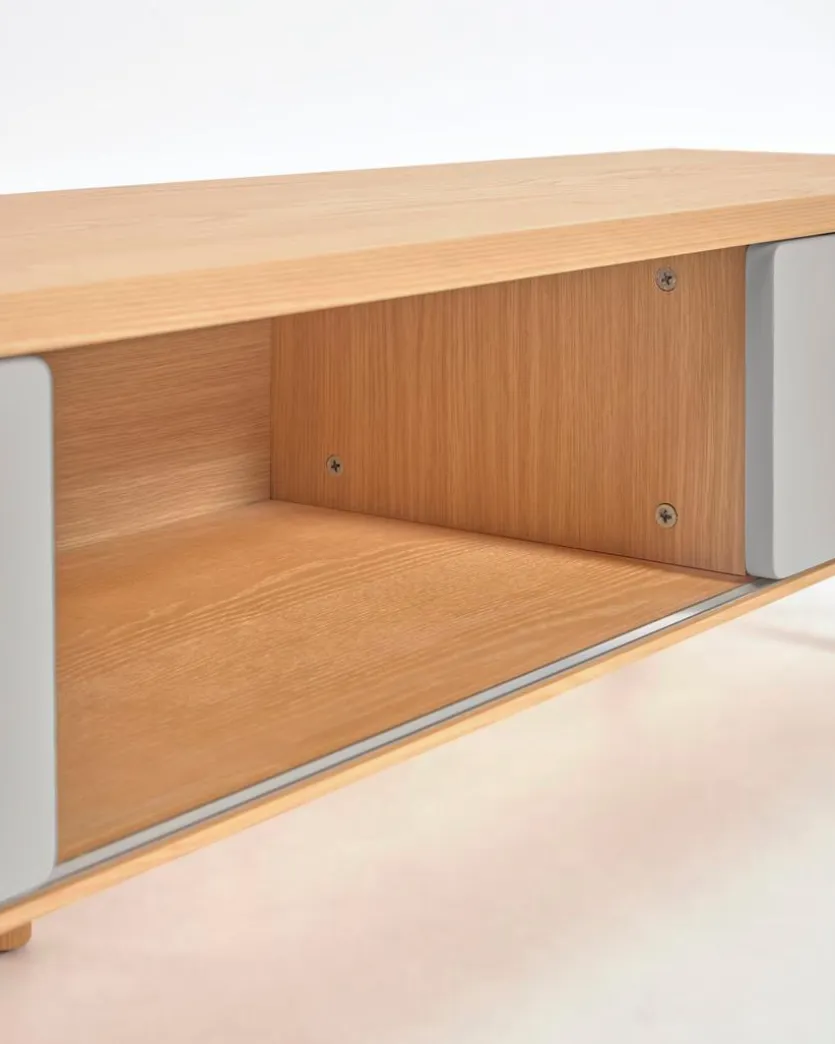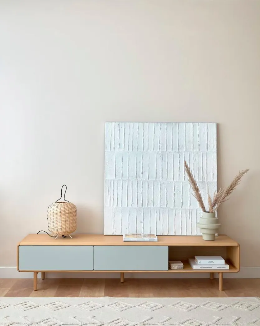 Das TV-Lowboard Anielle von Kave Home ist der perfekte TV-Unterschrank für das stilvoll eingerichtete Wohnzimmer. Es bietet Stauraum für unterschiedlichste Utensilien und eignet sich hervorragend als Platz für CD-Player, Spielekonsole und weitere Heimelektronik. Der Mix aus Vintage und modern mit farblich abgesetztem Korpus und abgerundeten Kanten macht das TV-Lowboard Anielle zu einem schicken Accessoire.