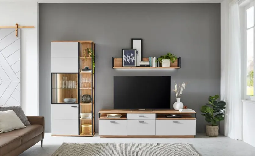 - Aus Holzwerkstoff (Spanplatte) mit kratzfester Melaminharzfolie in Modern White, Absetzung aus Spanplatte mit kratzfester Melaminharzfolie in Eiche Artisan, Sichtbare Rückwand aus Holzwerkstoff (HDF) mit kratzfester Melaminharzfolie in Eiche Artisan