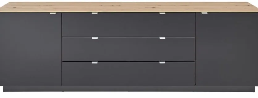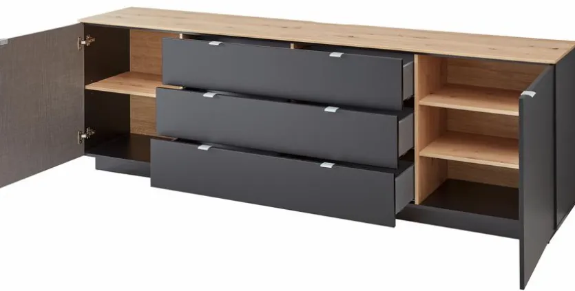 - Mit 2 Türen, 3 Einlegeböden und 3 Schubkästen mittig