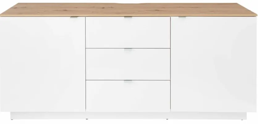 - Korpus aus Holzwerkstoff (Spanplatte) mit kratzfester Melaminharzfolie in Weiß, Front aus Holzwerkstoff (MDF) mit Tiefziehfolie in Weiß, Absetzung aus Holzwerkstoff (Spanplatte) mit kratzfester Melaminharzfolie in Artisan Eiche Nachbildung