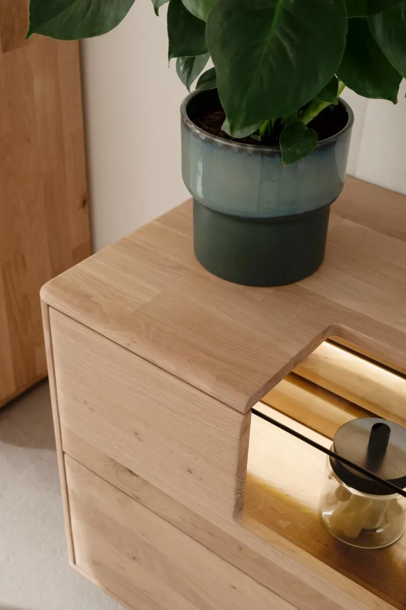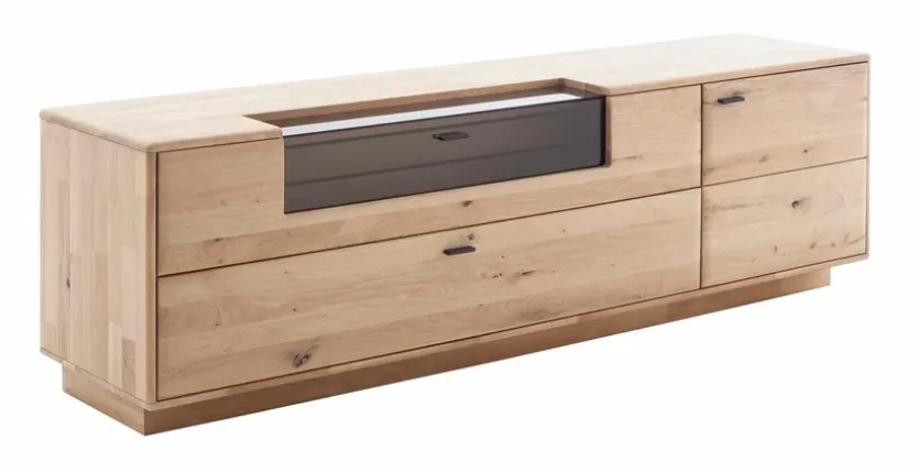 - Korpus aus Ast/Balkeneiche massiv keilgezinkt in Kristalleiche geölt, Front aus Ast/Balkeneiche massiv durchgehende Lamelle in Kristalleiche geölt