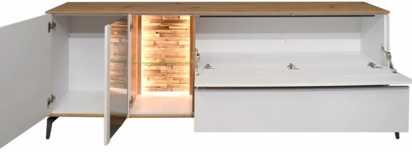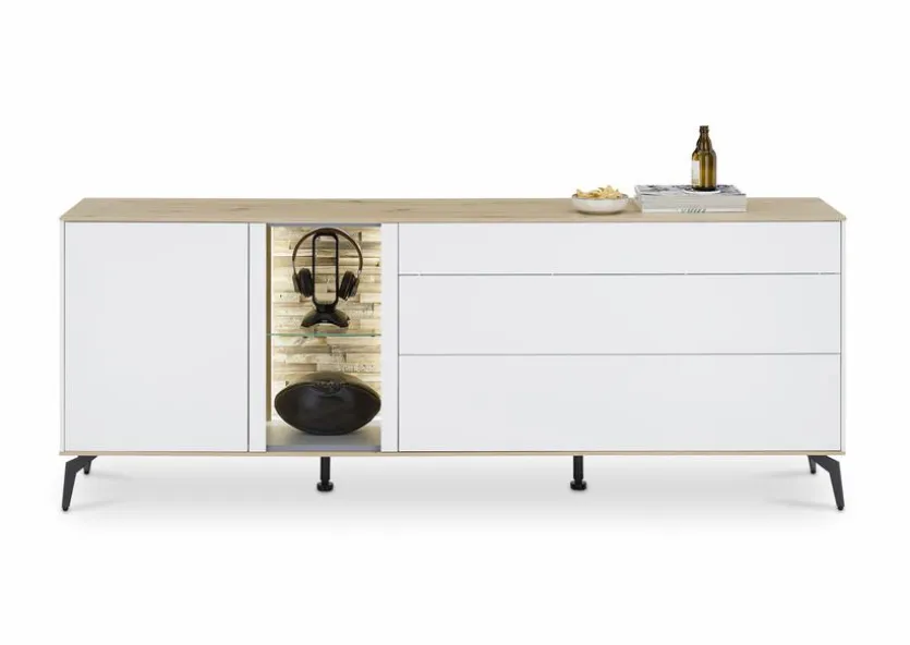 - Mit 1 Tür, 1 Glastür, 1 Klappe und 1 Schubkasten mit Selbsteinzug