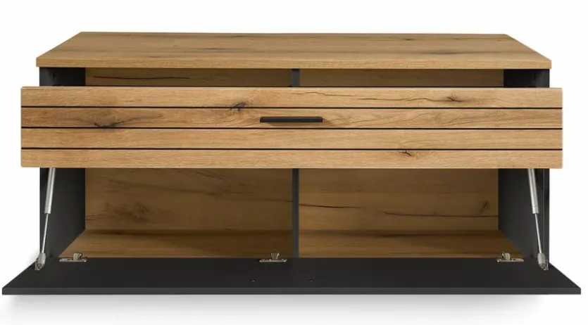 - Front mit Lamellen aus Holzwerkstoff (MDF) mit hochwertiger Dekorfolie in Coast Evoke Eiche, Front aus Holzwerkstoff (Spanplatte) mit kratzfester Melaminharzfolie in Anthrazit