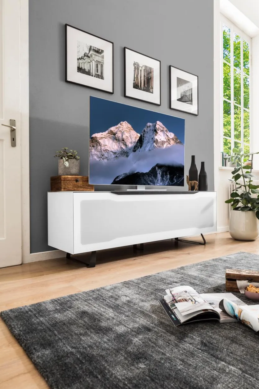 Das TV-Lowboard Ravenna ist mit einer aus matt-weißem Ätzglas gefertigten Frontklappe ausgestattet, die zur Gerätebedienung Infrarot-Strahlen durchlässt. Dadurch können alle Elektrogeräte im Inneren des TV-Unterschranks versteckt untergebracht werden. Weder Kabel noch Geräte stören damit das elegante Design des Möbels. Zusätzlich sorgen die Designfüße beim TV-Lowboard Ravenna für einen erhöhten Stand.