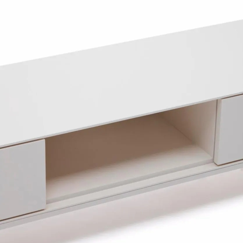 Das TV-Lowboard Vedrana von Kave Home ist eine famose Wahl für modern eingerichtete Räume. Lackierte Oberflächen bringen die schnörkellose Formgebung dieses TV-Unterschranks exzellent zur Geltung. Ein schlankes Gestell verleiht dem Möbel einen Look, der Leichtigkeit vermittelt. Ausgestattet ist das grifflos gestaltete TV-Lowboard Vedrana mit einem Push-to-open-System.
