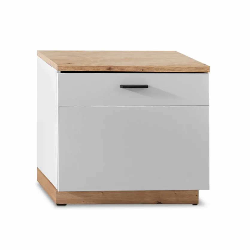 - Aus Holzwerkstoff (Spanplatte) mit kratzfester Melaminharzfolie in Modern White, Absetzung aus Holzwerkstoff (Spanplatte) mit kratzfester Melaminharzfolie in Eiche Artisan