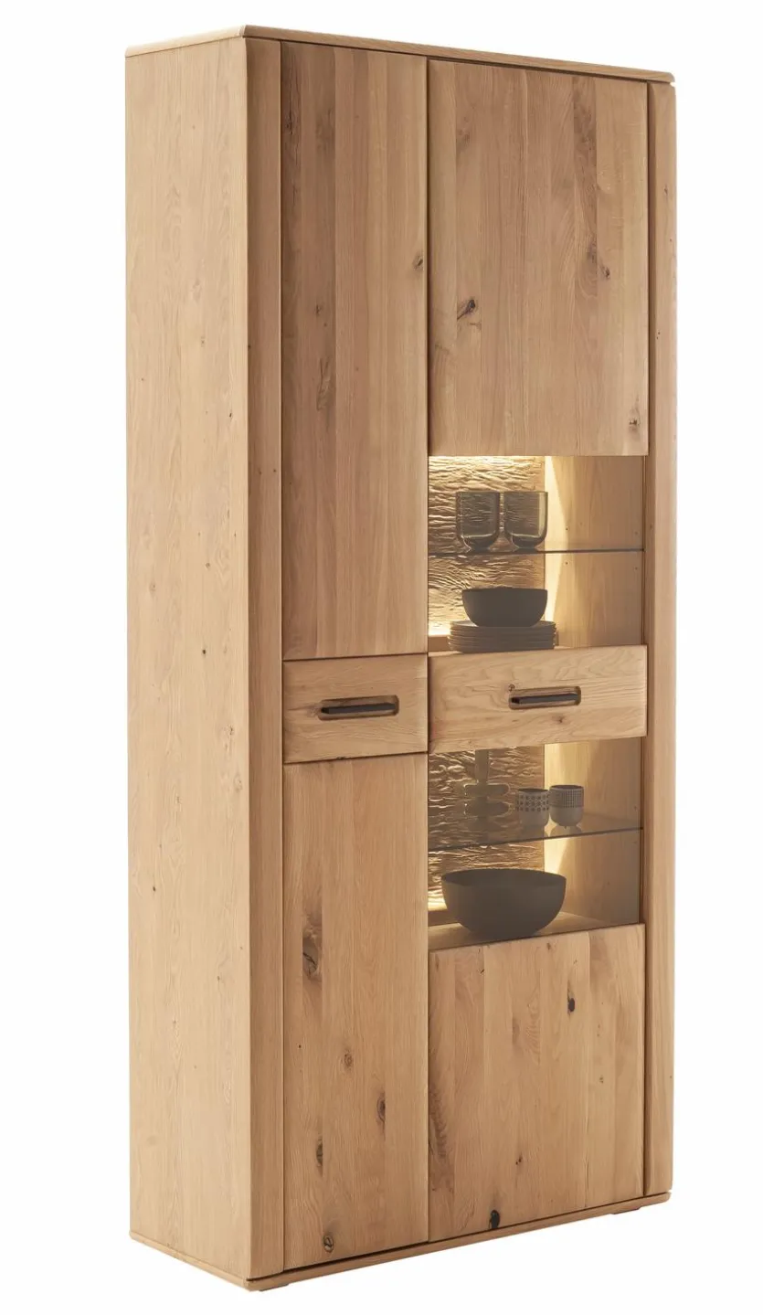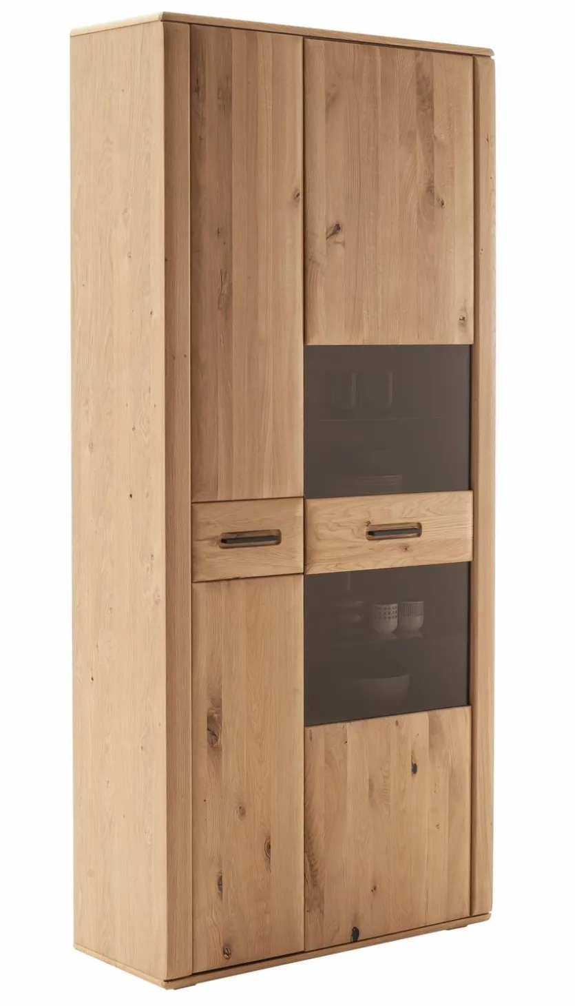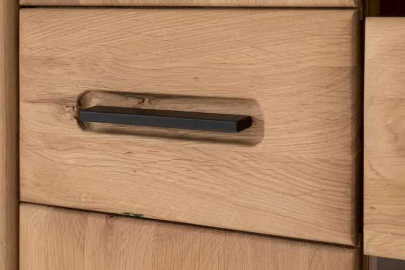 - Korpus aus Holzwerkstoff (Spanplatte) Ast/Balkeneiche furniert in Kristalleiche geölt, Front aus Ast/Balkeneiche massiv durchgehende Lamelle in Kristalleiche geölt