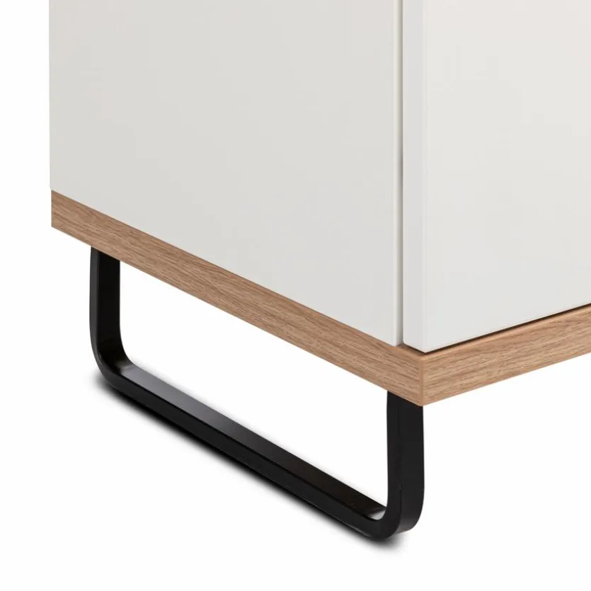 - Korpus und Front aus Holzwerkstoff (Spanplatte) mit kratzfester Melaminharzfolie in Polarweiß, Absetzung aus Holzwerkstoff (Spanplatte) mit kratzfester Melaminharzfolie in Artisan Eiche