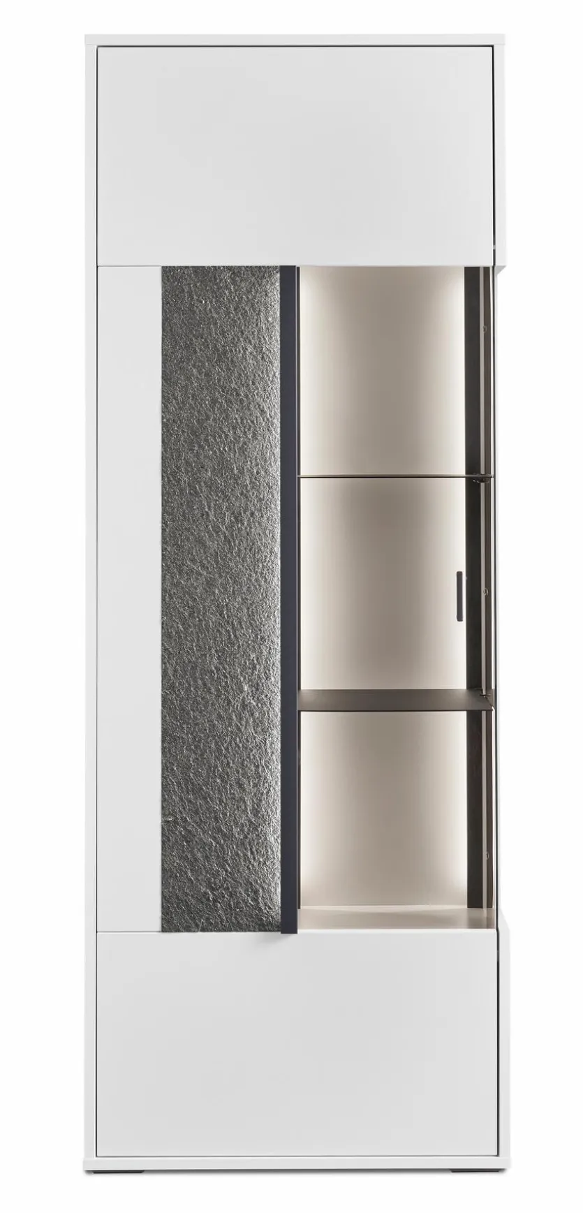 - Korpus und Front aus Holzwerkstoff (Spanplatte) mit kratzfester Melaminharzfolie in Weiß Matt, Absetzung aus Steinfurnier in Black Pearl-Sandstone