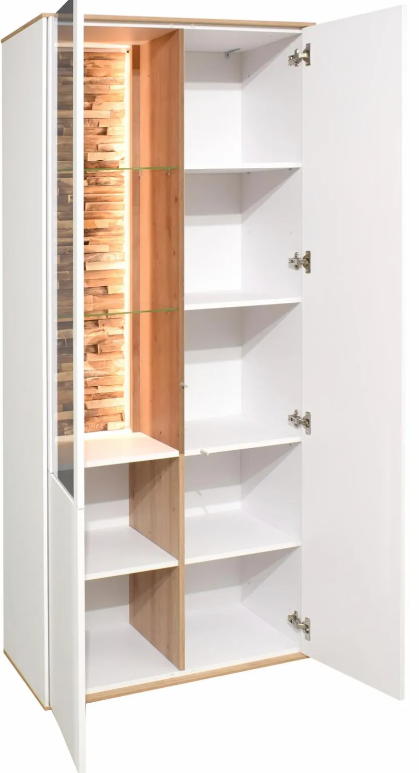 - Aus Holzwerkstoff (Spanplatte) mit kratzfester Melaminharzfolie in ice white supermatt mit Absetzung in Asteiche Nachbildung