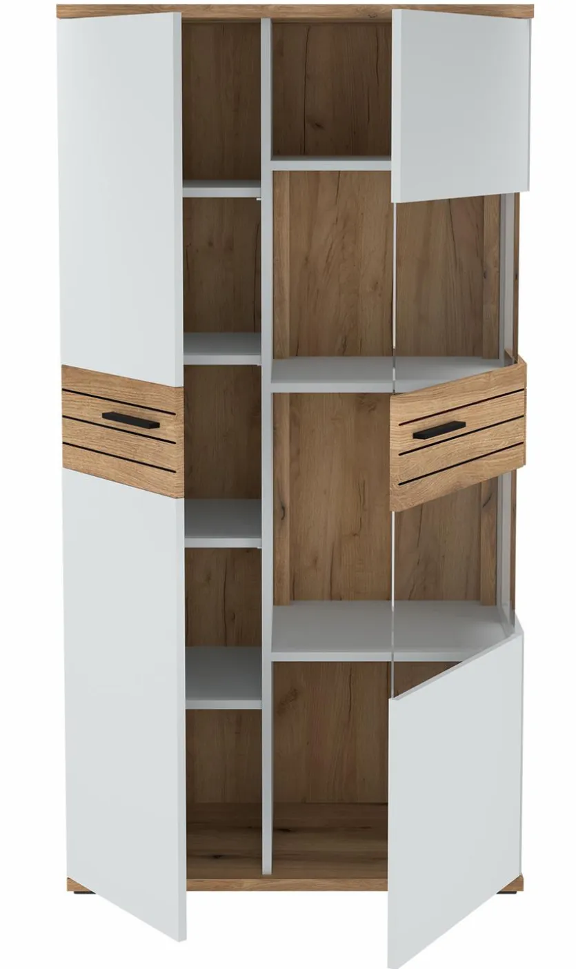 - Mit 2 Türen – 1 Türe davon mit Glasausschnitten, 4 Einlegeböden