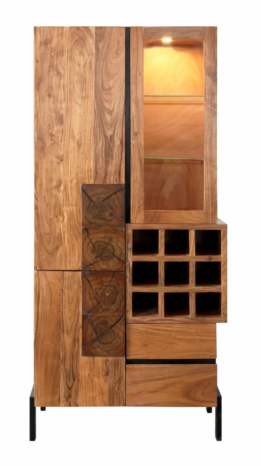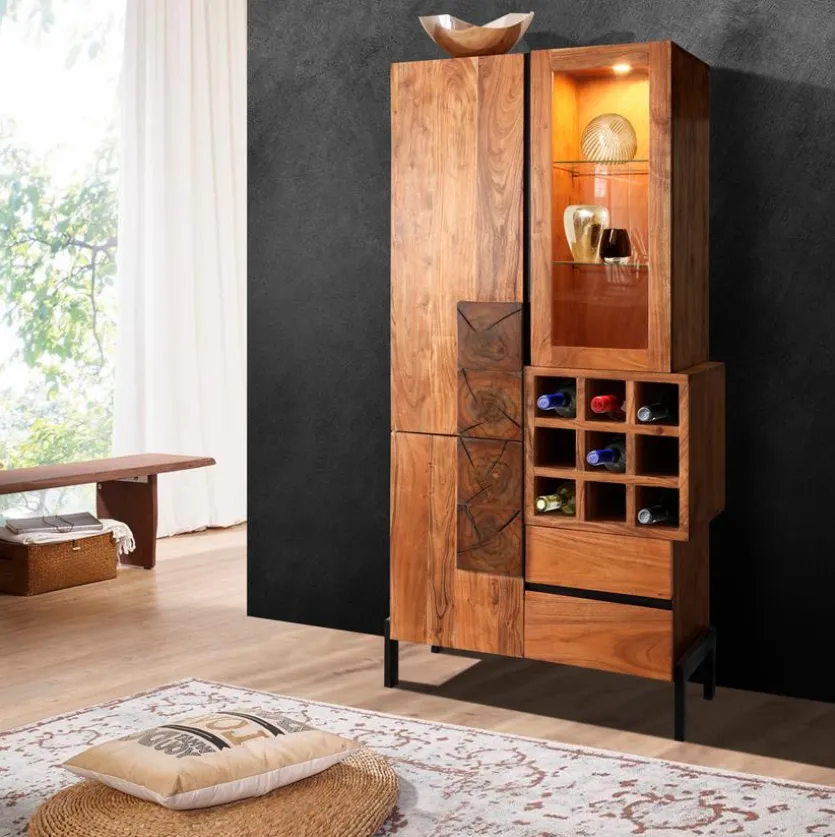 Schaffen Sie mit der Vitrine Root 1507 aus dem Hause WOLFMÖBEL ein zeitgemäßes Wohlfühl-Flair! Gemütliches Holz, gegen die Maser geschnittene Elemente und klare Symmetrien bestimmen die moderne sowie rustikale Ästhetik dieser Glasvitrine. Dank der Fächer für Flaschen stellt die Vitrine Root 1507 zudem für Weinliebhaber eine besonders interessante Option dar.