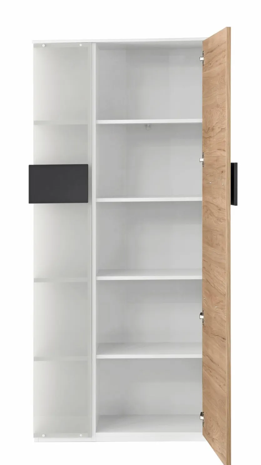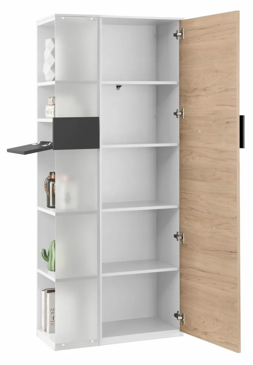 - Aus Spanplatte mit kratzfester Melaminharzfolie in weiß, Tür aus Spanplatte mit kratzfester Melaminharzfolie in Hickory, Absetzung aus Spanplatte mit kratzfester Melaminharzfolie in anthrazit, Teilfront links aus satiniertem Glas
