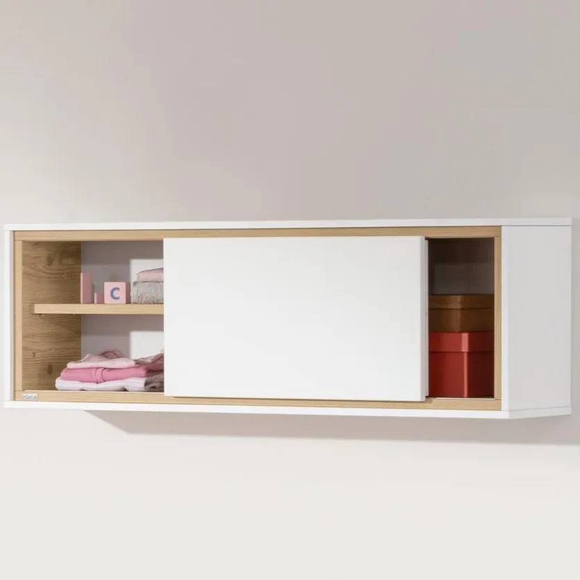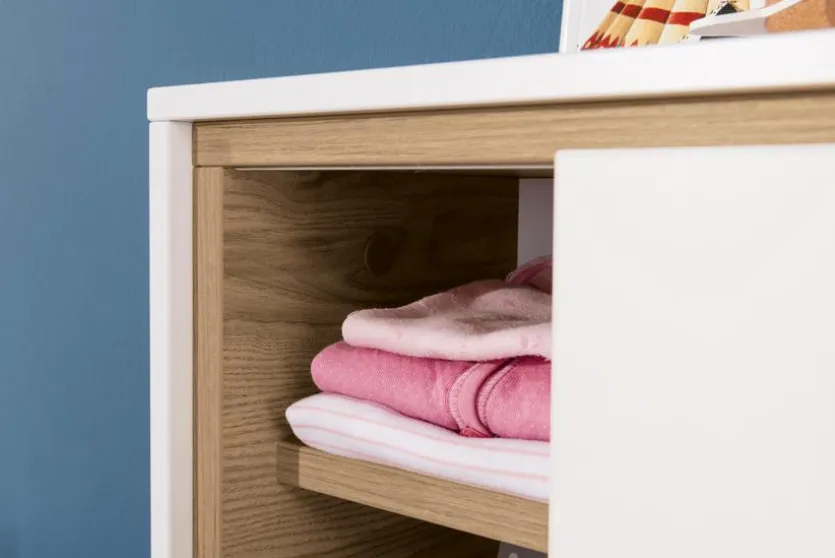 - Aus Holzwerkstoff (Spanplatte) mit kratzfester Melaminharzfolie in Kreideweiß, Innenkorpus und Einlegeböden aus Holzwerkstoff (Spanplatte) mit kratzfester Melaminharzfolie in Eiche-Montana-Nachbildung