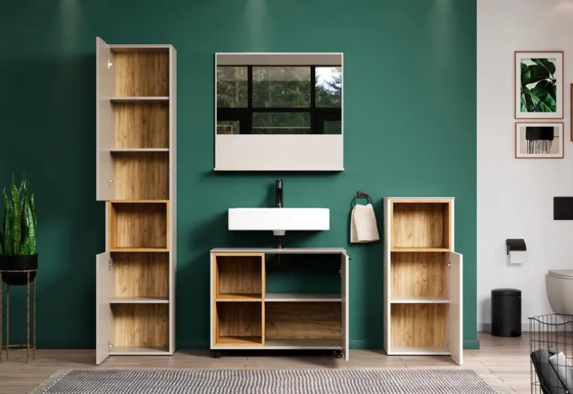 - Mit 1 Türe inkl. Softclose und 2 Einlegeböden (Belastbarkeit je Boden bis max. 5kg) und 2 offene Fächer