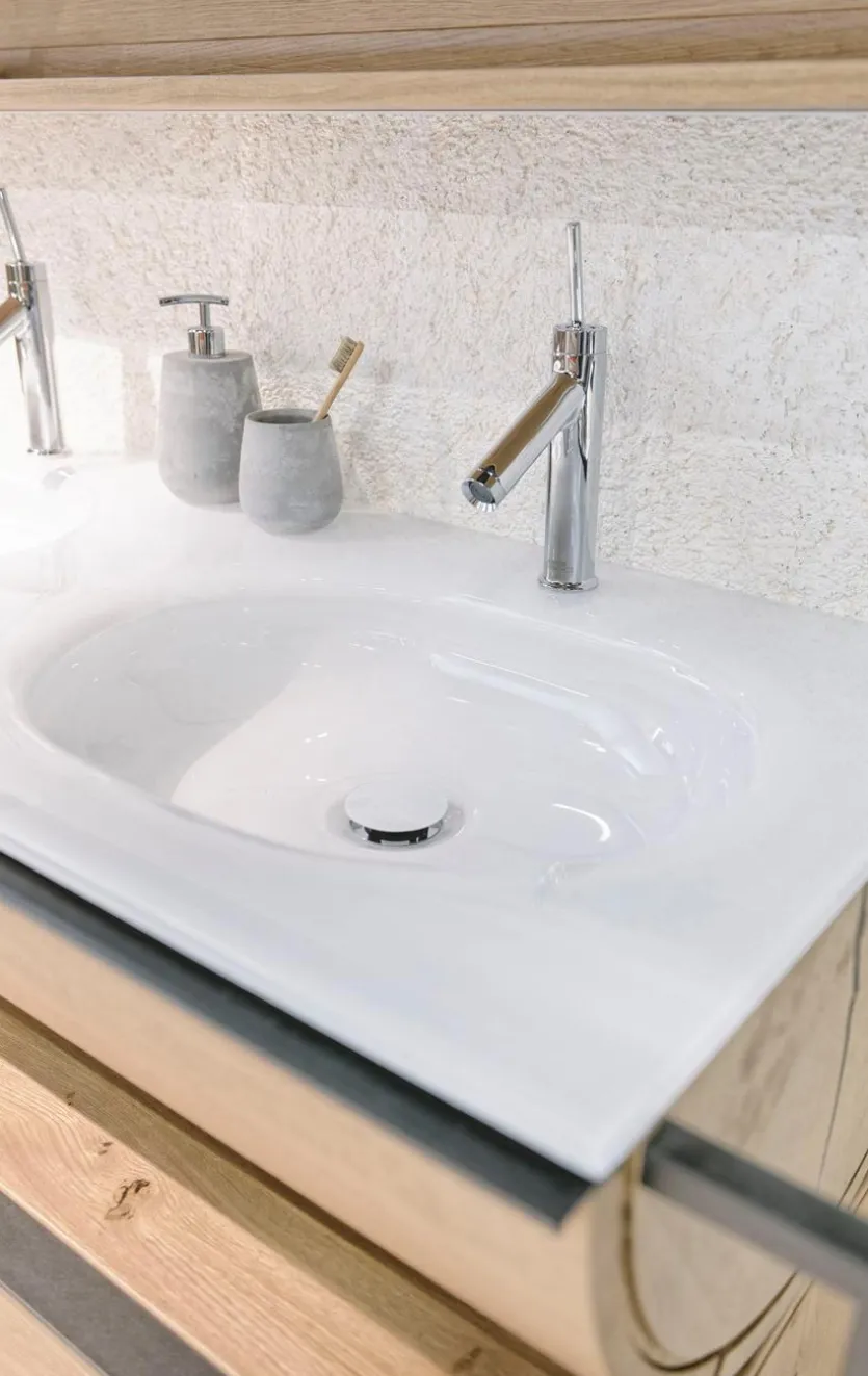 - Mit Waschtischunterschrank mit 1 Schublade, gezinkte Massivholzladen (Eiche) mit verdecktem, leichtgängigem Vollauszug