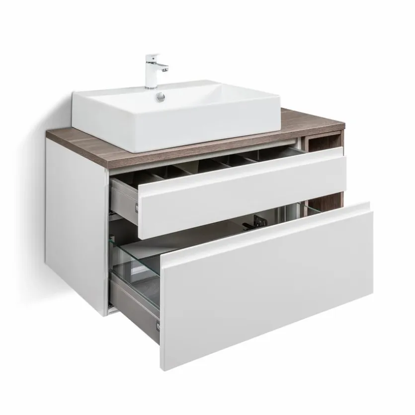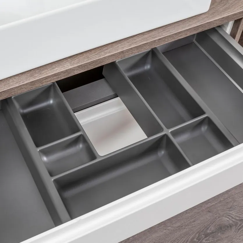 - Inkl. Waschtischunterschrank mit 1 Schubkasten mit Holzrückwand inkl. Siphonausschnitt und Kosmetikeinsatz und 1 Auszug mit Holzrückwand, mit Griffmulde
