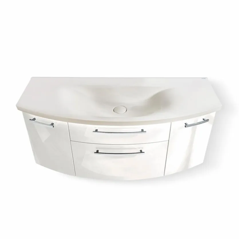 - Waschtischunterschrank mit 2 Türen (je 1 Glasfachboden) und 1 Schublade mit Einzugsdämpfung und 1 Schublade mit Einzugsdämpfung und Reling, inkl. Stangengriffe chromfarbig