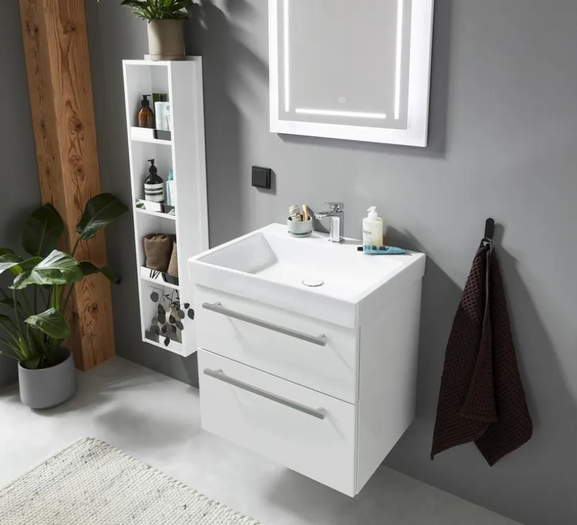 - Waschtischunterschrank mit 1 Metallauszug mit Einzugsdämpfung und Siphonausschnitt und 1 Metallauszug mit Einzugsdämpfung und Reling