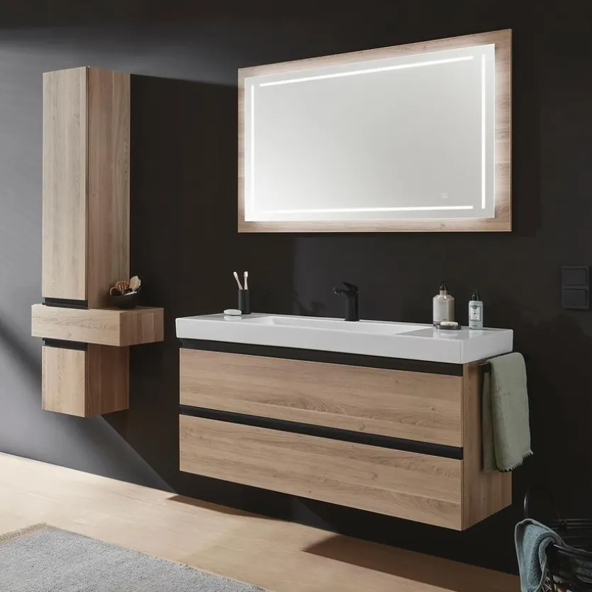 - Mit Waschtischunterschrank inkl. 1 Metallauszug mit Einzugsdämpfung und Siphonausschnitt und 1 Metallauszug mit Einzugsdämpfung und Reling