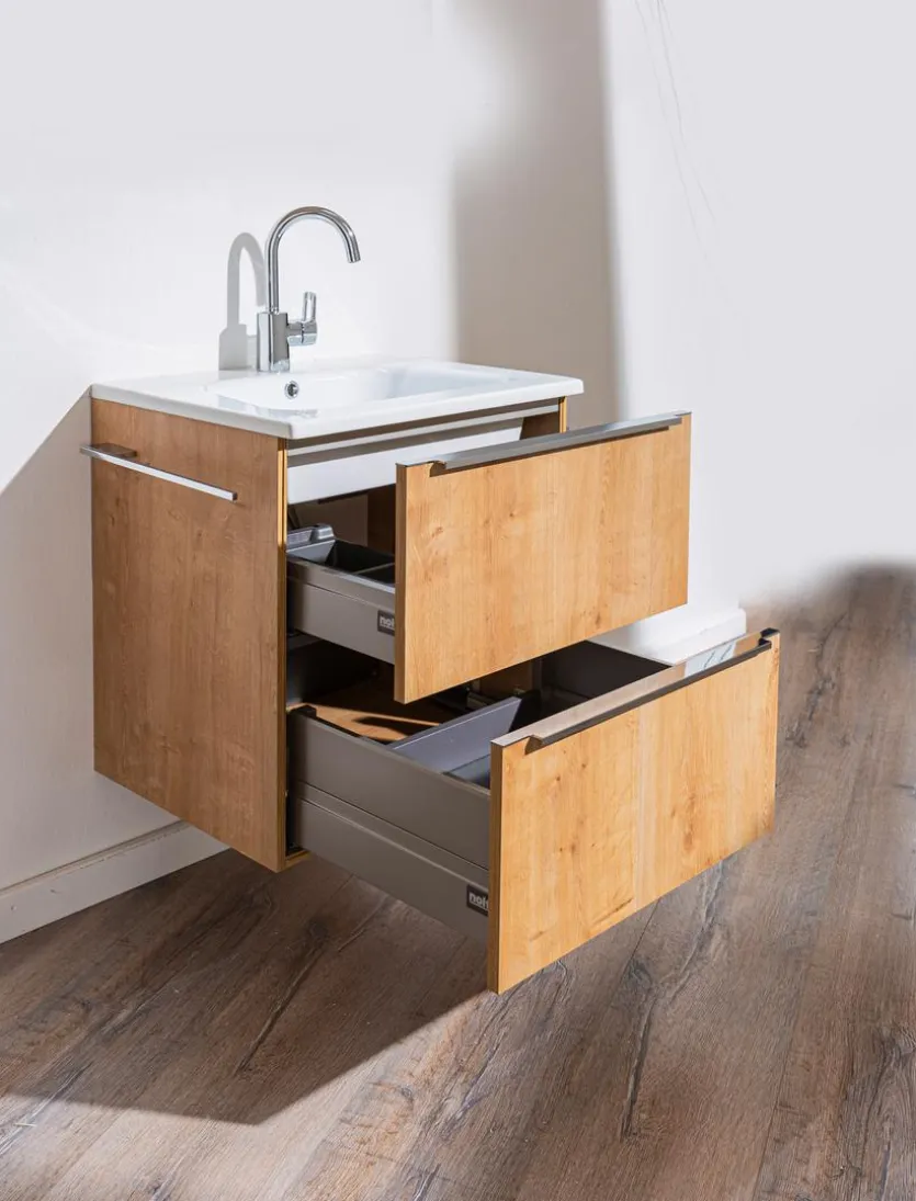 - Inkl. Waschtischunterschrank mit 2 Auszügen mit Holzrückwand, Siphonausschnitt und Kosmetikeinsatz