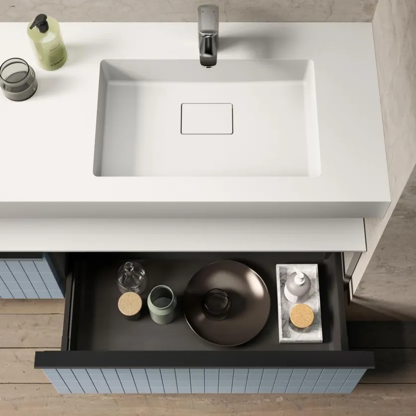 - 2x Waschtischunterschrank mit je 1 Auszug mit der Fronttype Grid und Griffleiste in schwarz matt