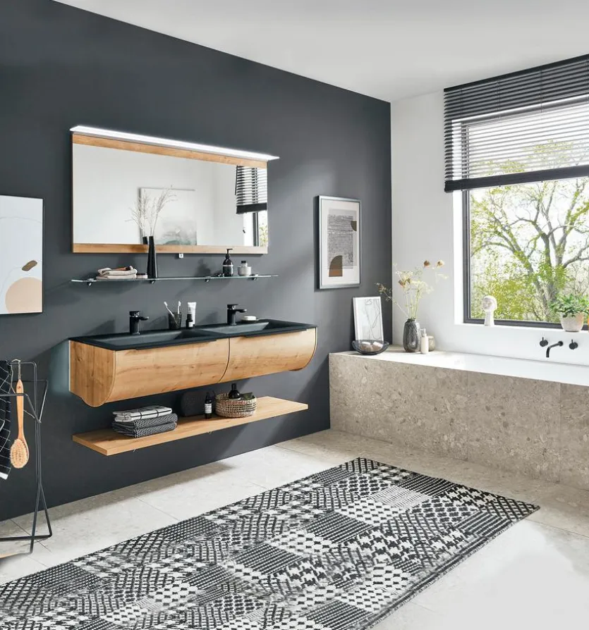 - Kombination bestehend aus Waschtischunterschrank mit 2 Metallauszügen mit Einzugsdämpfung und Siphonausschnitten und 1 Doppelwaschtisch aus Glas in schwarz matt mit 2 Hahnlöchern und 2 Clou Ab- und Überlaufsystemen