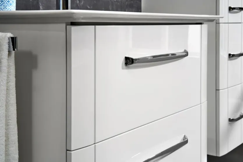 - Front aus Holzwerkstoff (MDF) mit kratzfester Melaminharzfolie in Weiß Hochglanz