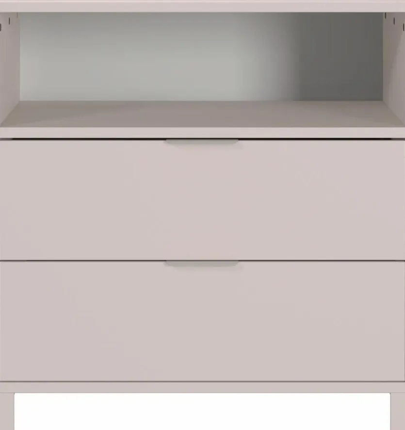 - Aus Holzwerkstoff (Spanplatte) mit kratzfester Melaminharzfolie in Kaschmir, Griffe aus Metall in Kaschmir