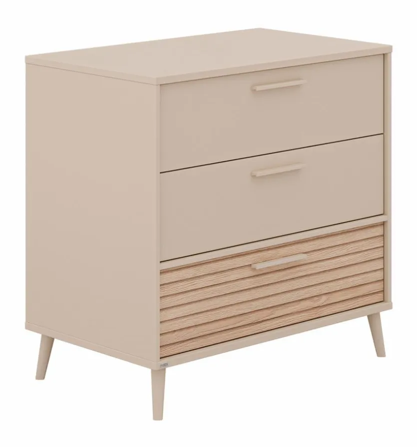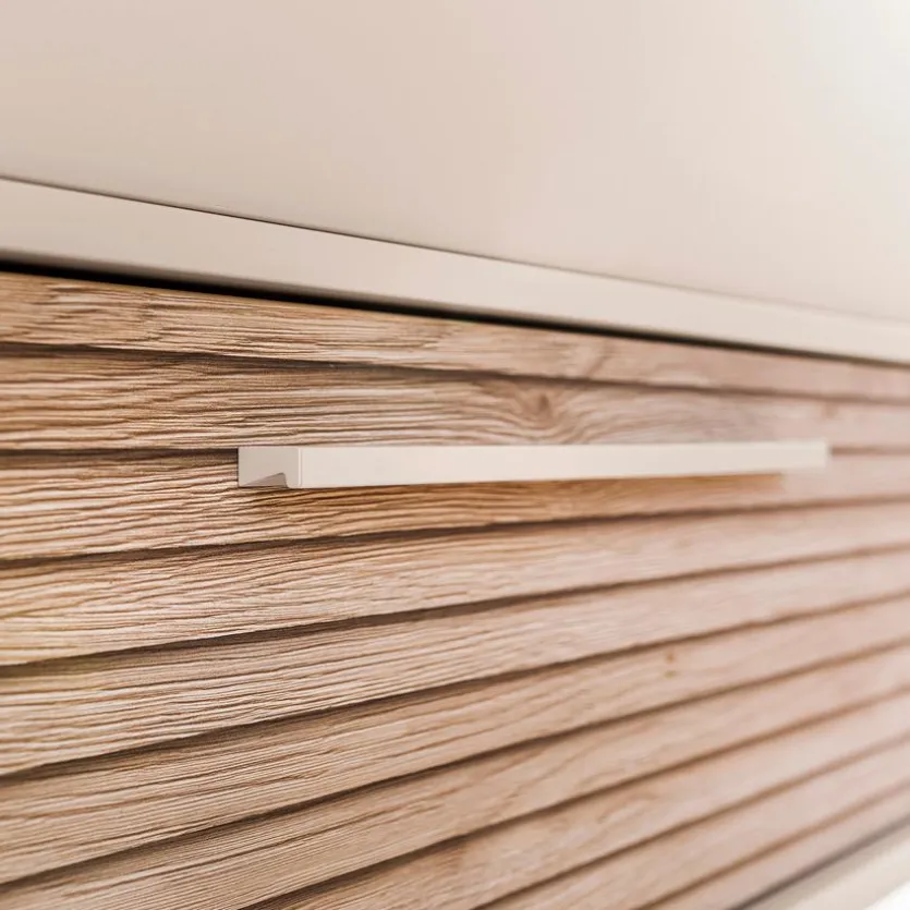 - Aus Spanplatte mit kratzfester Melaminharzfolie in Cashmere-Beige, Absetzung in Eiche Lamellenoptik, Füße und Griffe aus Kunststoff in Cashmere-Beige