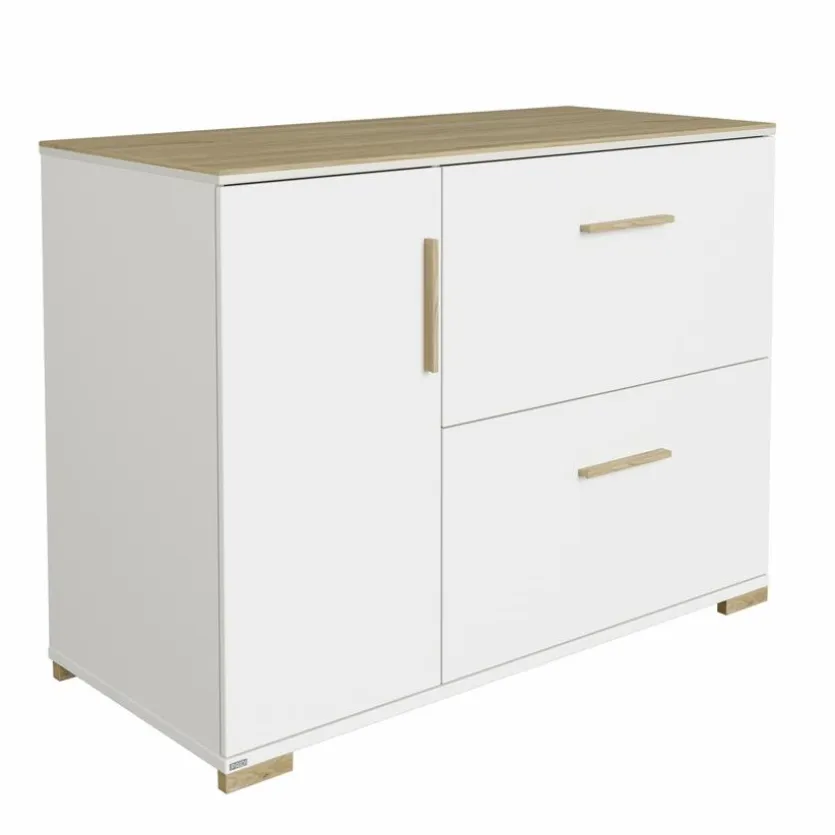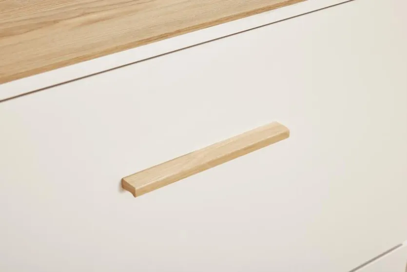 - Aus Holzwerkstoff (Spanplatte) mit kratzfester Melaminharzfolie in Off-White, Absetzung aus Holzwerkstoff (Spanplatte) mit kratzfester Melaminharzfolie in Eiche-Montana-Nachbildung, Griffe aus massiver Eiche