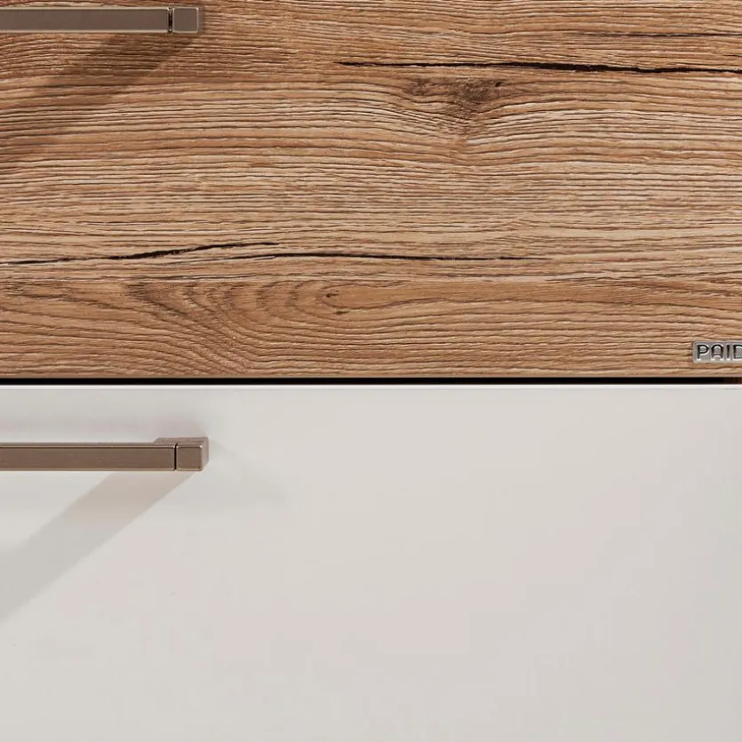 - Mit 2 breiten Schubkästen in Kreideweiß und 1 breiten Schubkasten in Eiche-Bordeaux unten