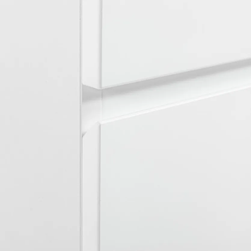 - Korpus aus Holzwerkstoff mit kratzfester Melaminharzfolie in weiß, Front aus Holzwerkstoff (MDF) in weiß lackiert