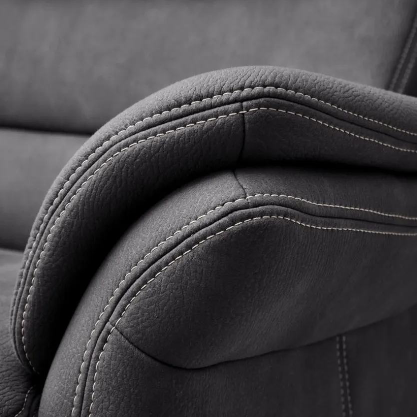 - Bezug aus Mikrofaser (Mammut) in grau mit beiger Kontrastnaht, Füße in Metall alufarbig