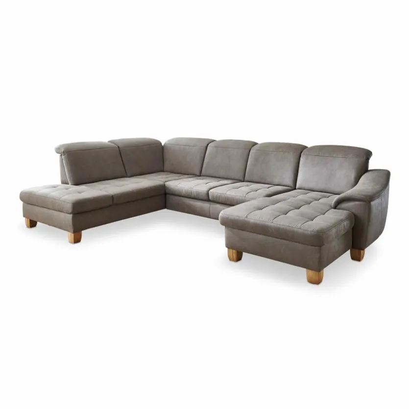 - Bezug aus Mikrofaser (Taurus) in Platin, Kontrastnaht in Beige, Füße aus Massivholz in Wildeiche geölt (E006-H07)