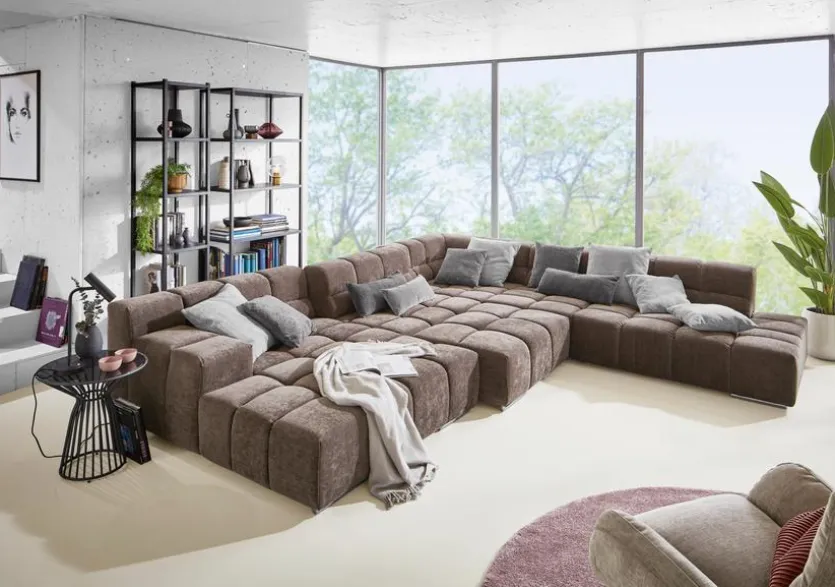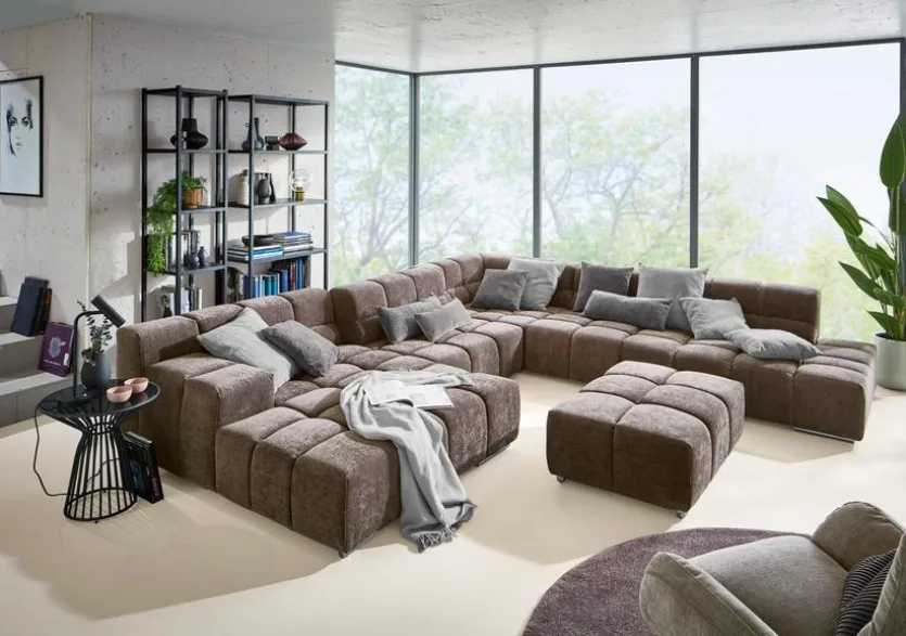 - Wohnlandschaft besteht aus Longchair mit Armlehne links, 1,5-Sitzer ohne Armlehne, Eckelement, 1-Sitzer ohne Armlehne, 2-Sitzer mit offenem Abschluss rechts