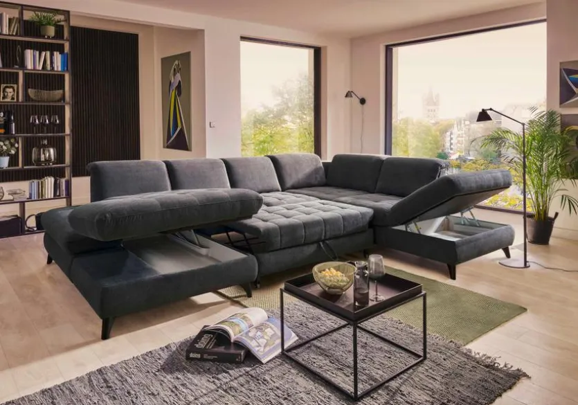 - Inkl. Schlaffunktion durch Frontauszug im 2-Sitzer, Bettkasten im Longchair und Stauraum im Abschlusselement