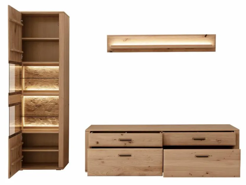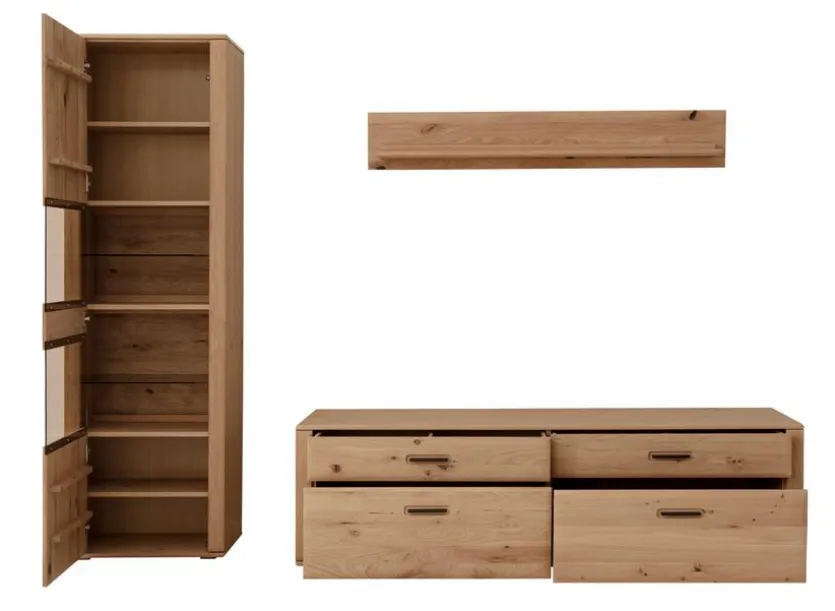 - Bestehend aus Vitrine, TV-Lowboard und Wandboard