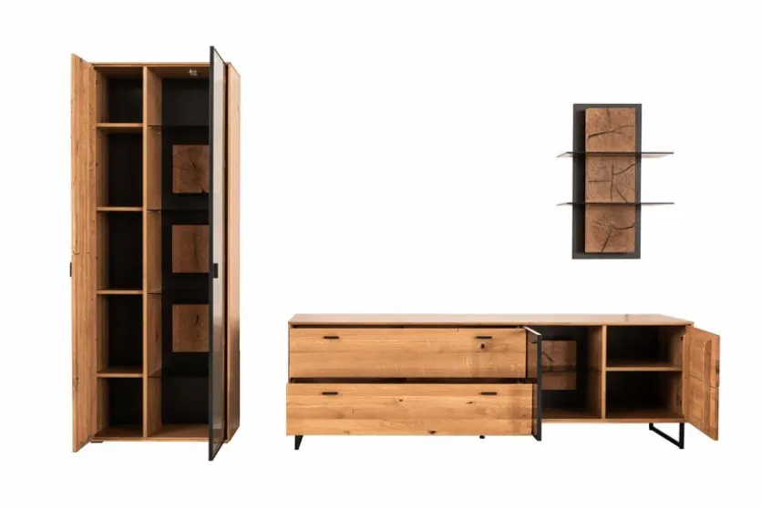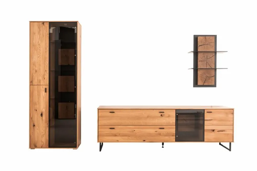 - Front aus Ast/Balkeneiche massiv, durchgehende Lamelle in Wildeiche geölt, Korpus aus Ast/Balkeneiche furniert in Wildeiche geölt