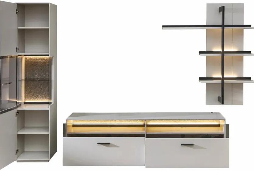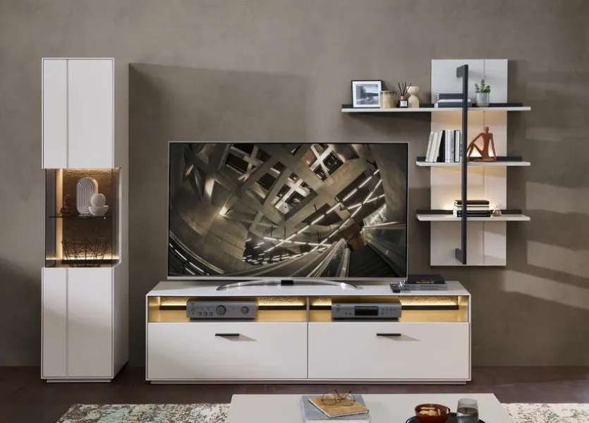 - Wohnwand besteht aus Vitrine, TV-Unterteil und Wandregal