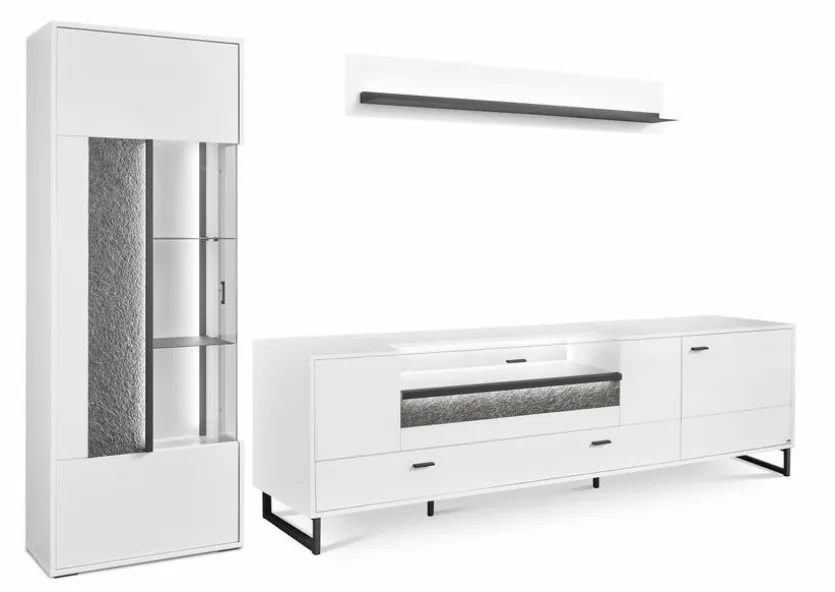 - Bestehend aus Vitrine, TV-Lowboard und Wandboard