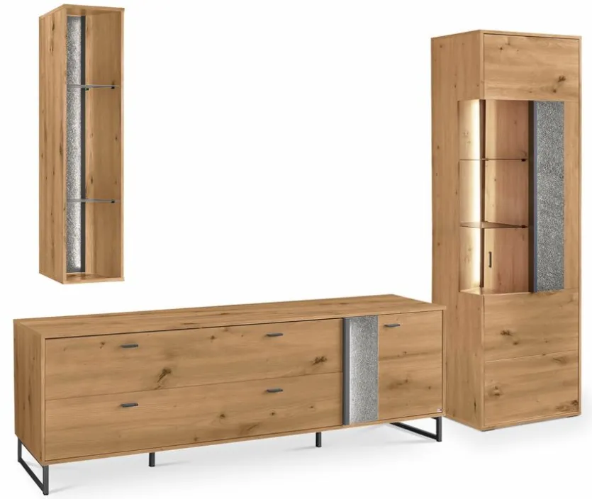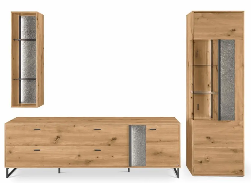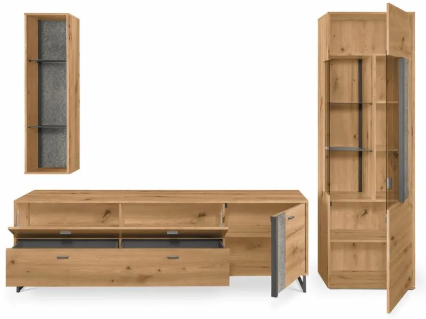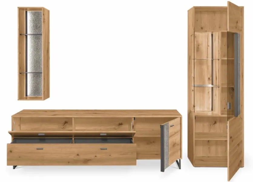 - Bestehend aus Vitrine, TV-Lowboard, Hängeregal