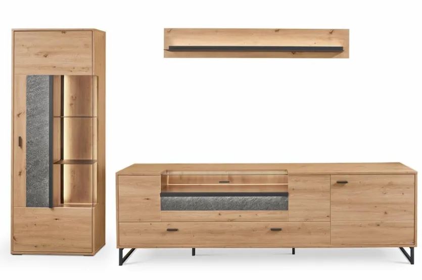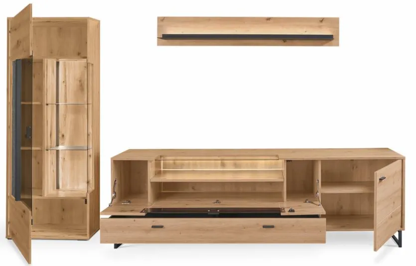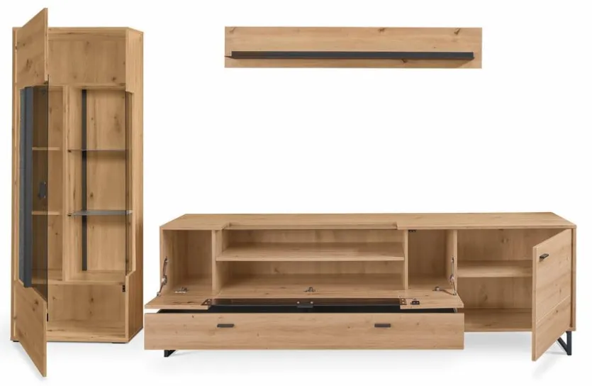 - Bestehend aus Vitrine, TV-Lowboard und Wandboard