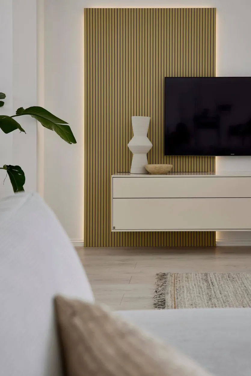- Wohnwand besteht aus Hängevitrine, Hängelowboard und einer Paneelwand
