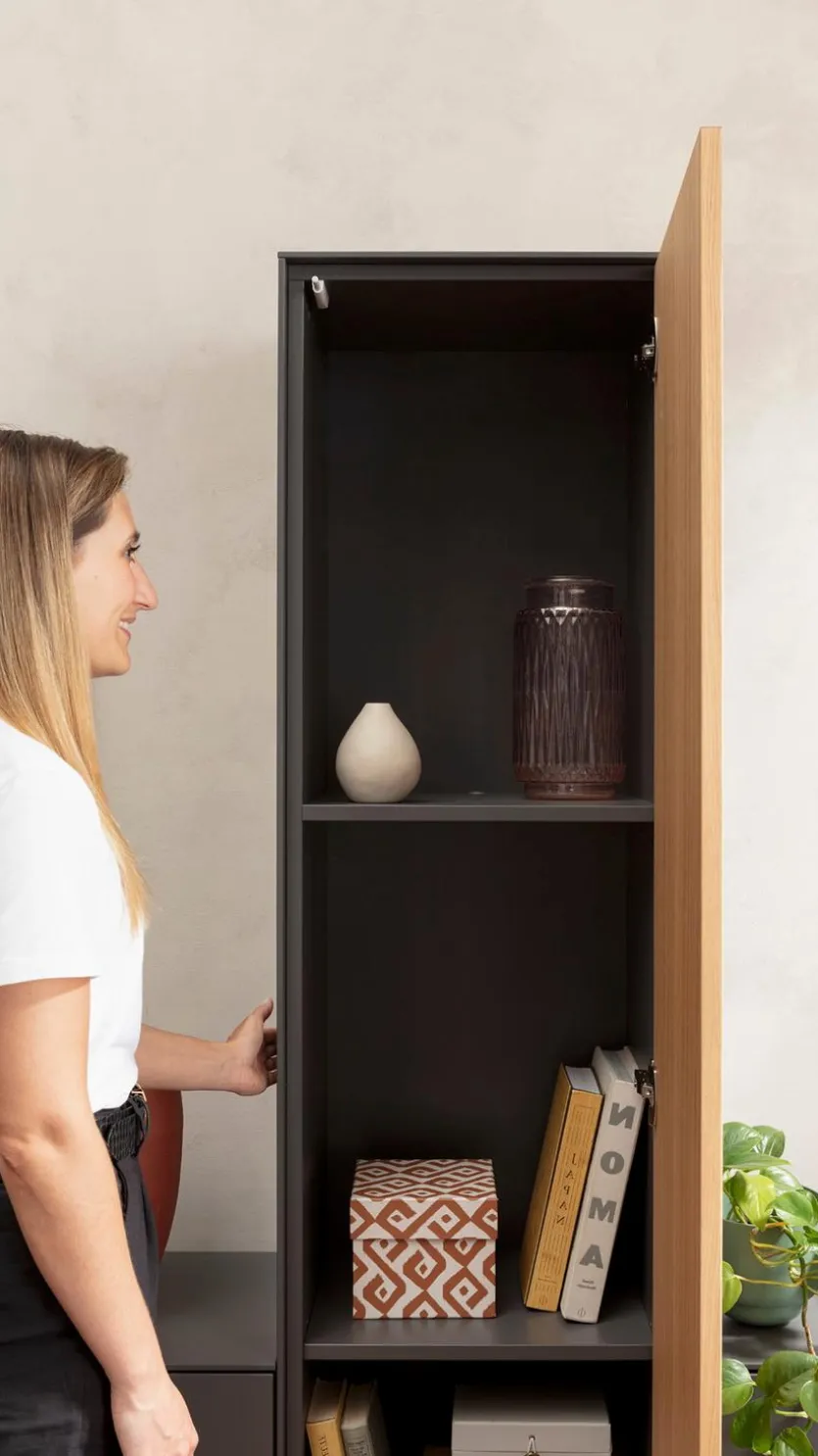 - Front der Hängeelemente aus Melaminharzfolie in Schiefergrau, Front des Standelements aus Echtholzfurnier in Riffeiche