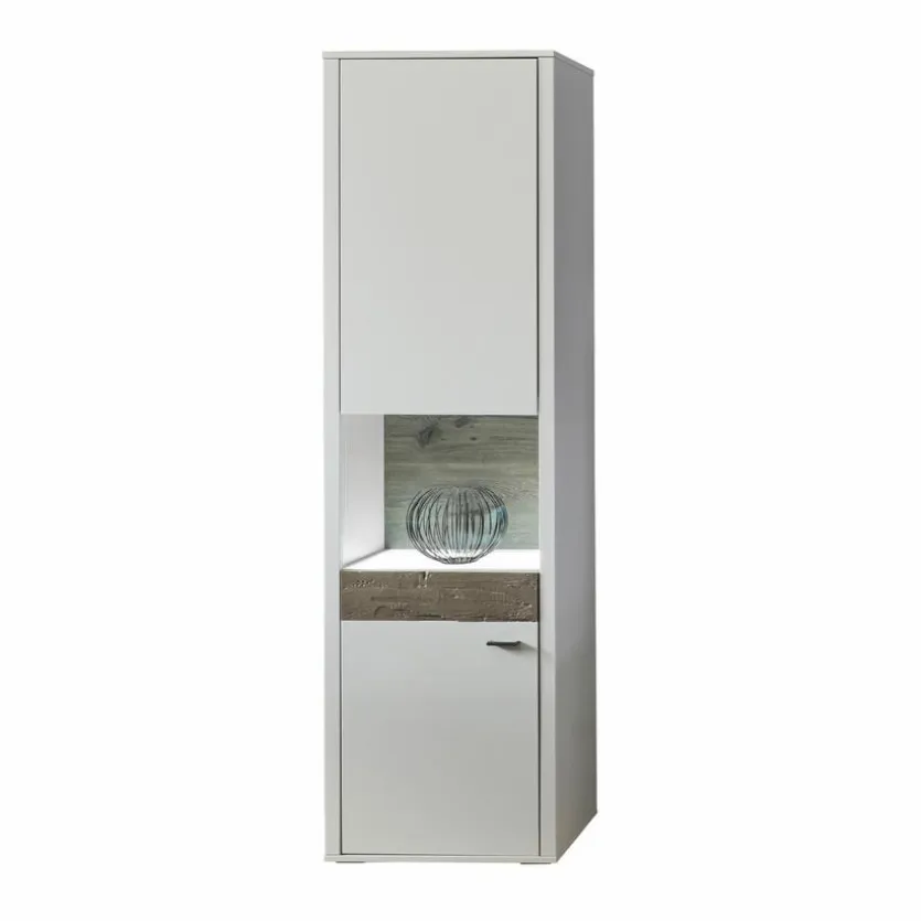 - Korpus aus Holzwerkstoff (Spanplatte) mit kratzfester Melaminharzfolie in „Modern White“, Front aus Holzwerkstoff (MDF) mit hochwertiger Dekorfolie in „Modern White“, Front-Absetzung in Kastanie Echtholz furniert, Sichtbare Rückwände in Vulcano glatt