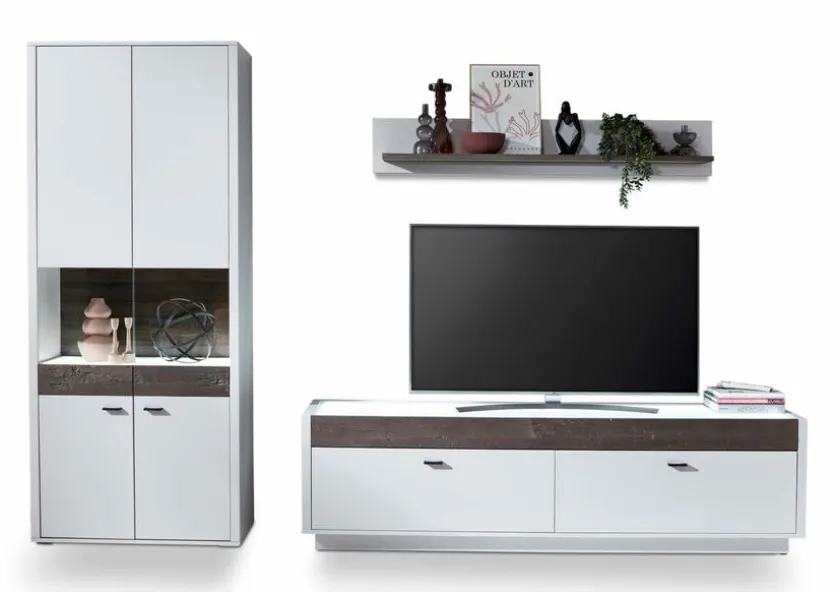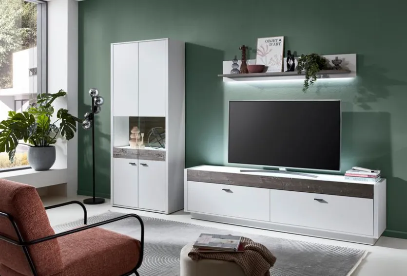 - Wohnwand bestehend aus Vitrine, TV-Lowboard und Wandboard