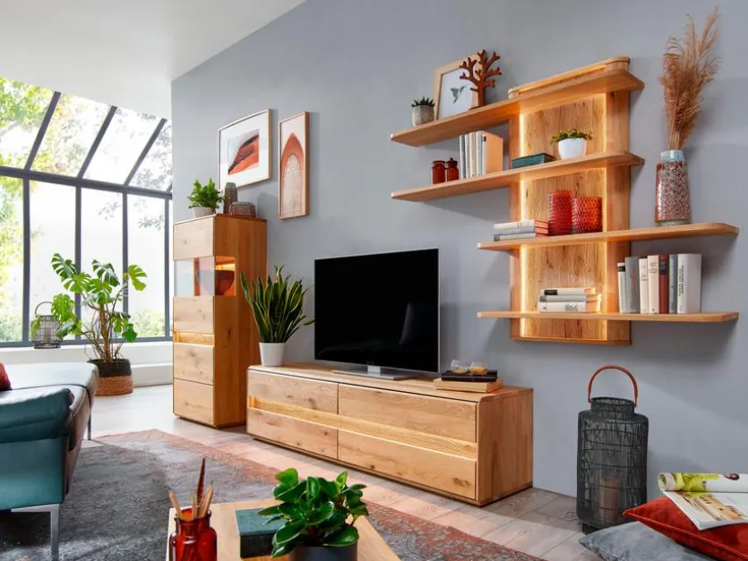 Oberflächen in natürlicher Holzmaserung verleihen der Wohnwand Missouri 3tlg. eine wohnlich warme Ausstrahlung. Die Schrankkombination besteht aus einem Wandregal mit vier Ebenen, einem Lowboard und einem Vitrinenschrank. In den Regalfächern und in der Vitrine lassen sich liebgewonnene Wohnaccessoires wie Reiseandenken oder Sammelstücke individuell arrangieren. Auf der stabilen Oberplatte des Lowboards der Wohnwand Missouri 3tlg. ist für ein zeitgemäßes Multimediaequipment Platz.
