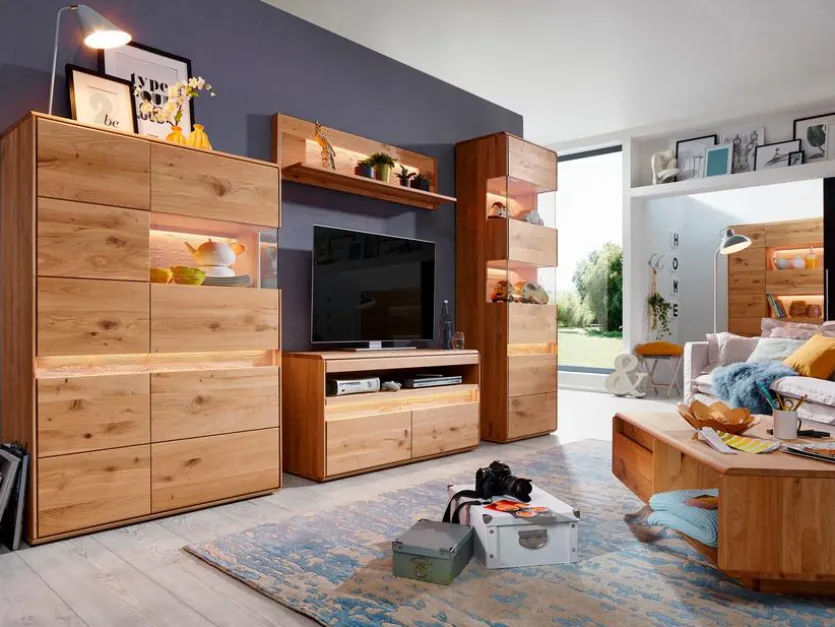 - Wohnwand aus Highboard, Wandboard, TV-Lowboard und Vitrine